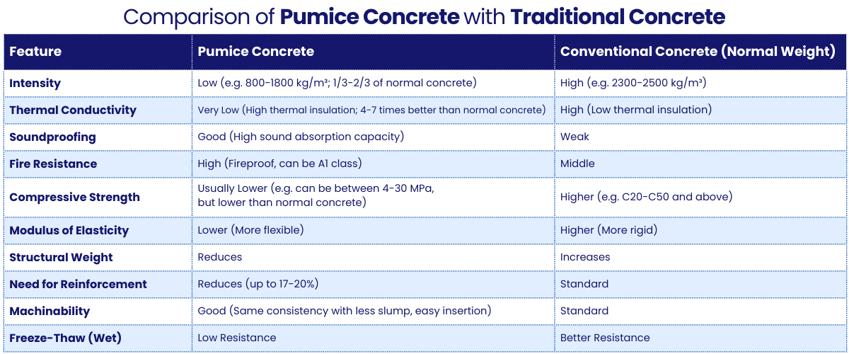 In addition to its lightness, pumice concrete offers superior insulation properties. Thanks to its porous structure, its thermal conductivity is quite low; it can provide 4 to 7 times better thermal insulation than traditional concrete. This increases energy efficiency in buildings and reduces heating and cooling costs. Similarly, pumice concrete has good sound insulation and sound absorption capacity, which increases acoustic comfort in spaces. Its fire resistance is also higher than traditional concrete; it can withstand high temperatures and does not emit harmful gases during fire. It is also stated that pumice concrete exhibits a more elastic behavior than normal concrete and therefore can perform better under earthquake loads.